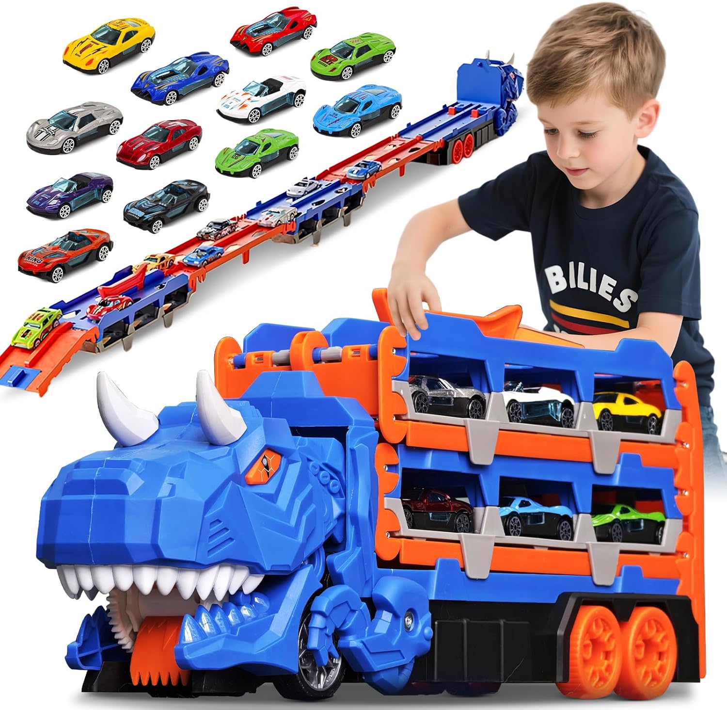 Ciężarówka laweta dinozaur tor wyścigowy zestaw 12 autek