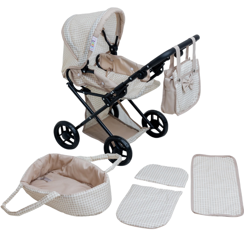 Wózek lalkowy kombinowany – głęboki i sportowy z nosidełkiem, ma regulowane oparcie i podnóżek. Wewnątrz gondola z uszami służąca do przenoszenia lalki, a w niej pościel. W środku umocowano taśmę, która służy do zapięcia lalki w wersji sportowej wózka.