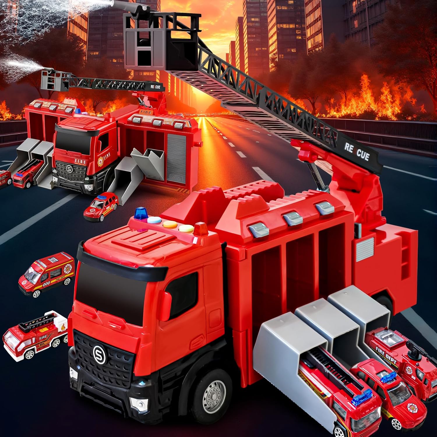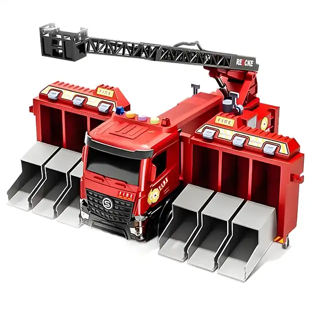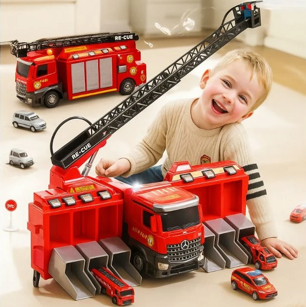 Duży wóz strażacki dla dzieci z garażem, który po rozłożeniu zamienia się w mobilną bazę strażacką z rampami. Zestaw zawiera 4 pojazdy ratunkowe, ruchomą drabinę teleskopową, światła i dźwięki oraz funkcję spryskiwania wodą, co zapewnia realistyczną zabawę.