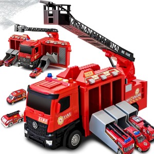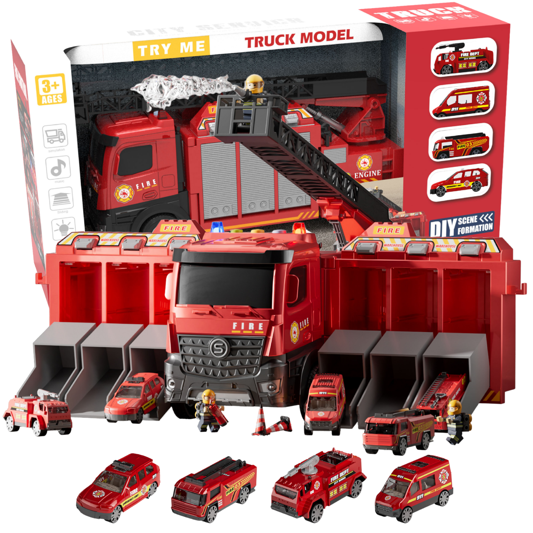 zestaw strażacki 5w1 – wóz transportowy + 4 pojazdy ratunkowych