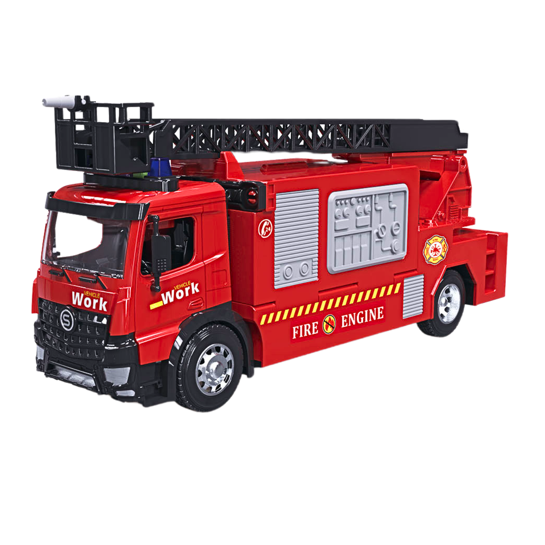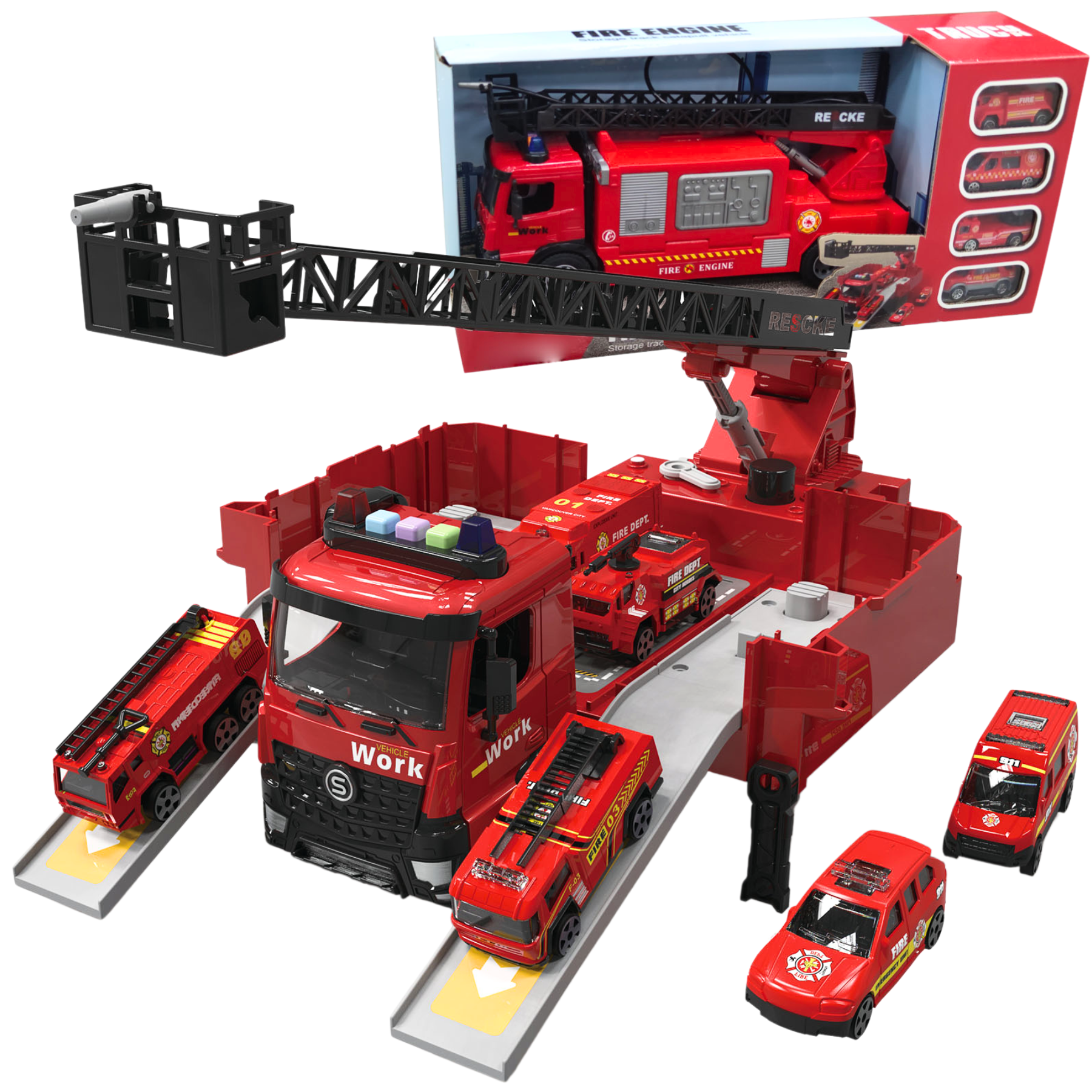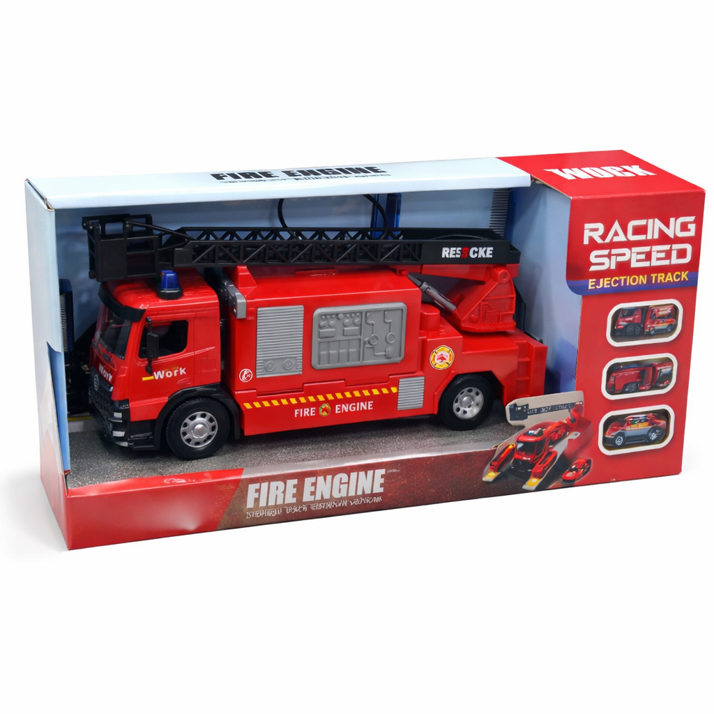 Duży wóz strażacki dla dzieci z rozkładaną naczepą, który po otwarciu zamienia się w parking dla samochodów ratunkowych. Zabawka wyposażona w światła, dźwięki oraz ruchomą drabinę, co urozmaica zabawę i pozwala tworzyć różne scenariusze akcji ratunkowych.